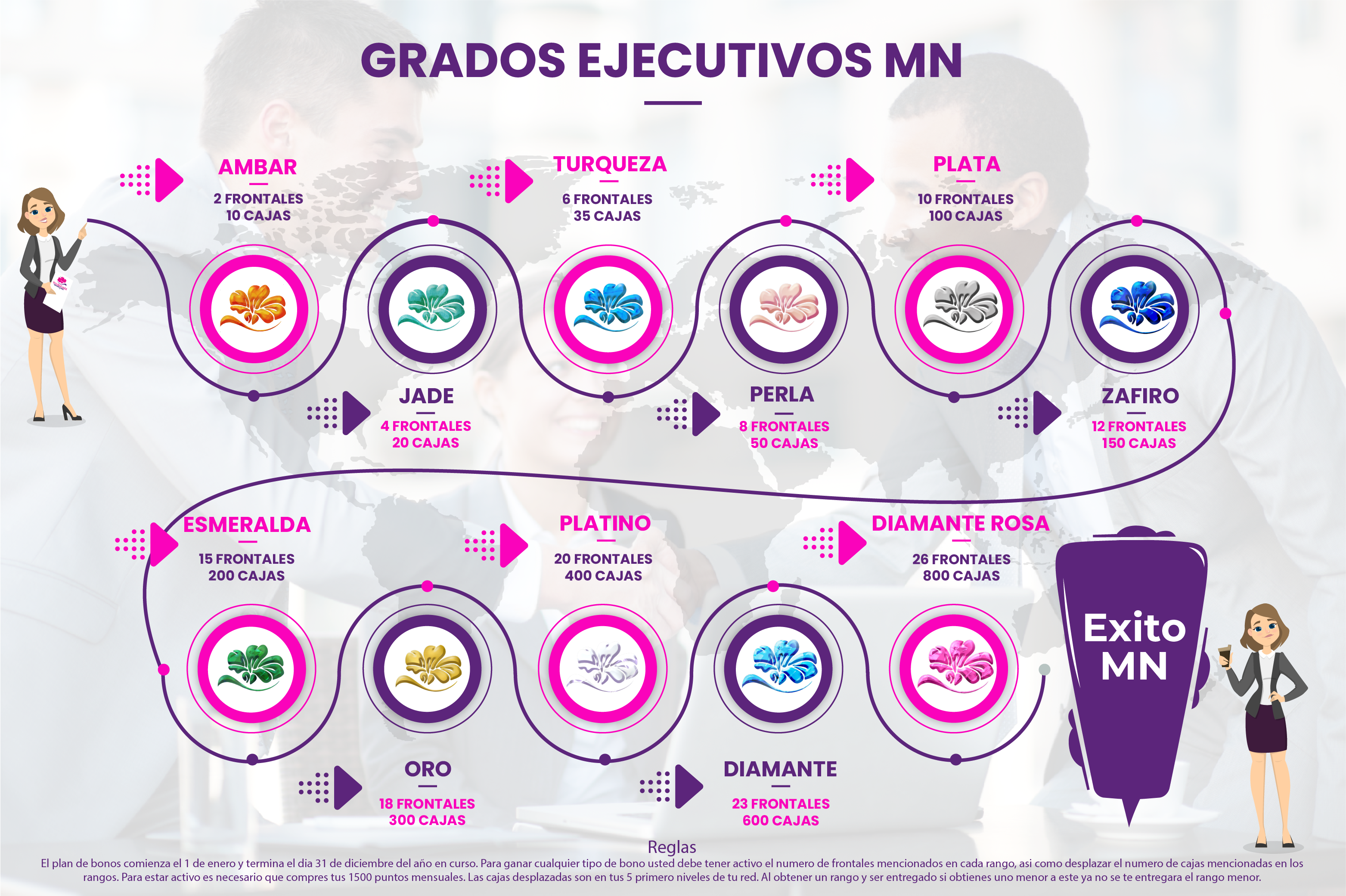 A continuacion te mostramos el camino que podras recorrer para obtener cada uno de nuestros rangos ejecutivos y llegar a ser un LIDER MN.